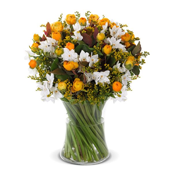 בוקה צפוף על בסיס נוריות ונרקיסים בגוונים של לבן וצהוב בתוספת סולידגו וירוקים.המחיר אינו כולל אגרטל, התמונה משקפת את הגודל הבינוני.